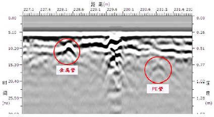 左側為高亮金屬管雷達圖像,右側為PE管雷達圖像