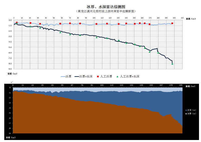 圖3 雷達獲取的高精度冰厚水深綜合斷面圖(與傳統方法測量數字比對,測量結果更精準)